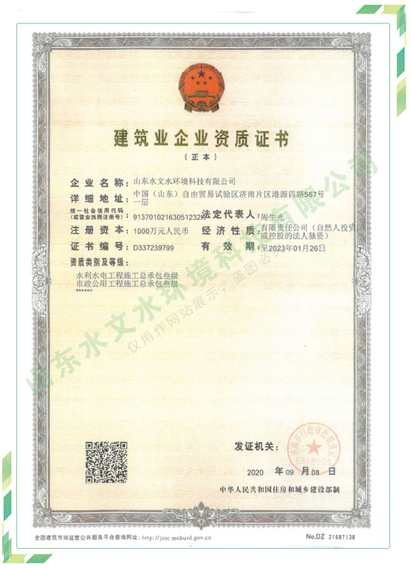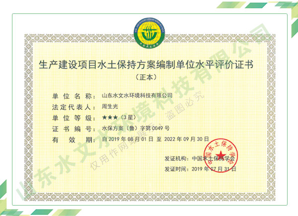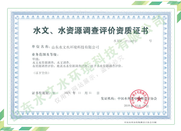 公司擁有水利工程設(shè)計(jì)、水土保持、水文水資源調(diào)查評(píng)價(jià)、水資源論證、建設(shè)項(xiàng)目環(huán)境影響評(píng)價(jià)、市政公用工程施工總承包、水利水電工程施工總承包、電子與智能化工程專業(yè)承包等資質(zhì),2017年通過質(zhì)量管理體系、環(huán)境管理體系、職業(yè)健康安全管理體系認(rèn)證;2020年被評(píng)為國家級(jí)高新技術(shù)企業(yè),同年被中國水利企業(yè)協(xié)會(huì)推薦為第一批“合同節(jié)水服務(wù)企業(yè)”;2021年被山東省、濟(jì)南市評(píng)為 “專精特新”中小企業(yè)。業(yè)務(wù)范圍涉及水利工程設(shè)計(jì);節(jié)水設(shè)計(jì)、改造、水平衡測試;山洪災(zāi)害調(diào)查;城市水資源調(diào)查評(píng)價(jià);建設(shè)項(xiàng)目水土保持方案編制、監(jiān)測、驗(yàn)收、水土保持規(guī)劃;水安全保障規(guī)劃、建設(shè)項(xiàng)目水資源論證、規(guī)劃水資源論證;建設(shè)項(xiàng)目環(huán)境影響評(píng)價(jià);入河排污口論證;防洪影響評(píng)價(jià);市政公用工程施工、水利水電工程施工、電子與智能化工程施工等。